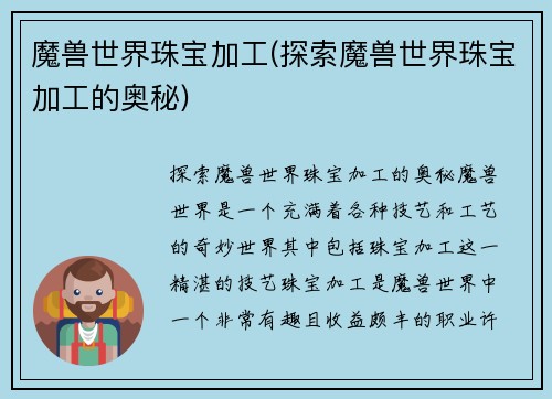 魔兽世界珠宝加工(探索魔兽世界珠宝加工的奥秘)